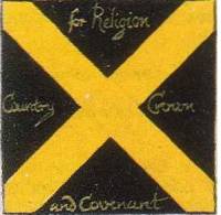 The flags of Argyle's regiment taken on the Preston campaign in 1648 were of the usual Covenanter pattern, bearing the cross of St Andrew. The field was black and the cross yellow. Split between the four black segments was the motto in yellow “FOR RELIGION COUNTRIE KING AND COVENANTS”4). (Illustration 1)